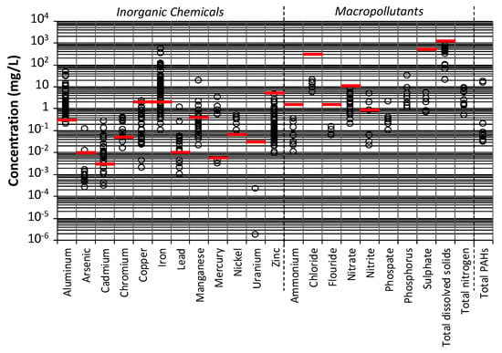 Limiting the attention to macropollutants, it emerges that only nitrite in RSA (Figure 3) and chloride, sulfates and total dissolved solids in MZ (Figure 4) occurred in concentrations higher than the corresponding national legal limit. It is interesting to observe that in Figure 3, most data refer to inorganic chemicals, such as some common heavy metals (727 versus 107 which regard the other groups: macropollutants and PAHs). This may be related to the fact that mining is one of the most important economic activities in RSA and different investigations were carried out to monitor the quality of surface water receiving mine drainage. Moreover, heavy metals in surface water may also be due to runoff of soil where fertilizers and biocides were used for agriculture needs [42]. Only a few data (176) are available for MZ (see Figure 4) referring to [27,29].
