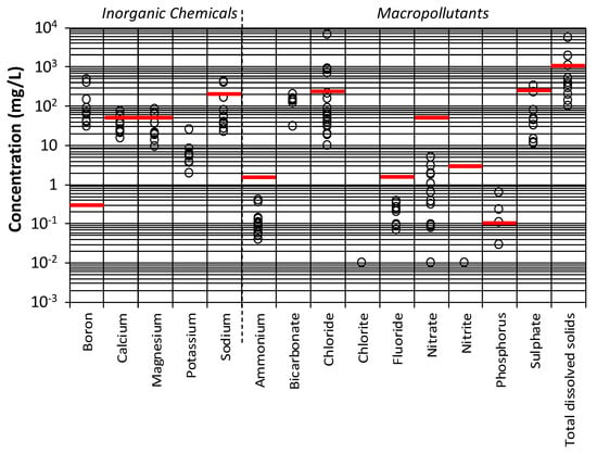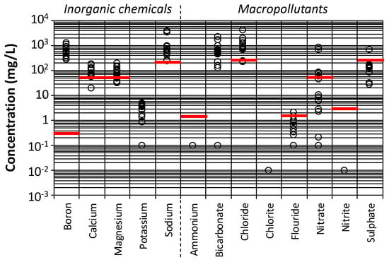 Observed concentrations (circles) of inorganic chemicals and macropollutants in surface water in the reviewed studies referring to Mozambique and the corresponding limits (red dashes) set by current national legislation (red line) for drinking water. Data from: [27,29].
