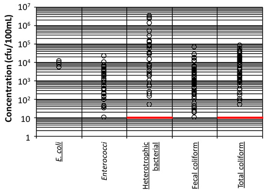 Observed concentrations of microorganisms (circles) in surface water in the reviewed studies referring to South Africa and the corresponding limits set by SANS-241 (red dashes) for drinking water. In the X axis, the underlined names refer to indicator bacteria, those not underlined refer to pathogen bacteria. Data from: [2,3,28,36,44,51,56].