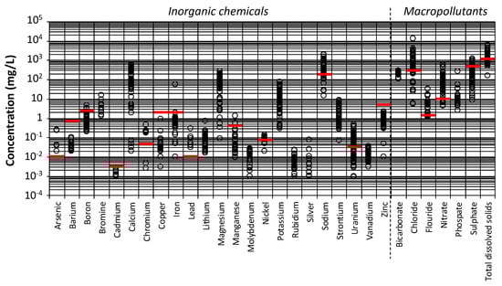 Observed concentrations (circles) inorganic chemical and macropollutants in groundwater in the reviewed studies referring to South Africa and the corresponding limits (red dashes) set by SANS-241 (red line) for drinking water. Data from: [5,21,22,23,35,52,53,57].