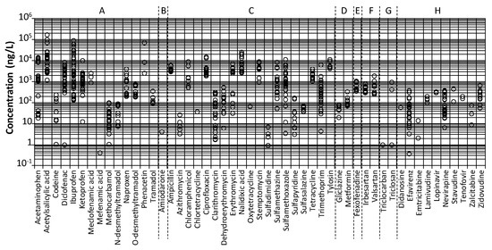 Observed concentrations of micropollutants belonging to classes (A) (Analgesics and anti-inflammatories), (B) (Antiarrhythmic agents), (C) (Antibiotics), (D) (Antidiabetic), (E) (Antihistamines), (F) (Antihypertensives), (G) (Antiseptics), and (H) (Antivirals) in surface water in the reviewed studies referring to South Africa. Data from: [20,24,25,26,40,43,45,46,48,49,55,59,60].