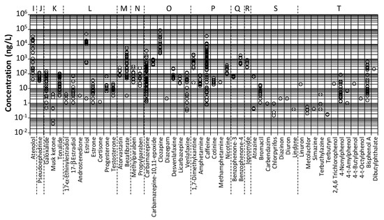 Selected investigations dealing with micropollutants refer to different surface water bodies in RSA (see Figure 2) and provide concentrations of compounds belonging to the 20 classes compiled in Table 1. The collected data are reported in Figure 8 and Figure 9, grouped according to their class.
