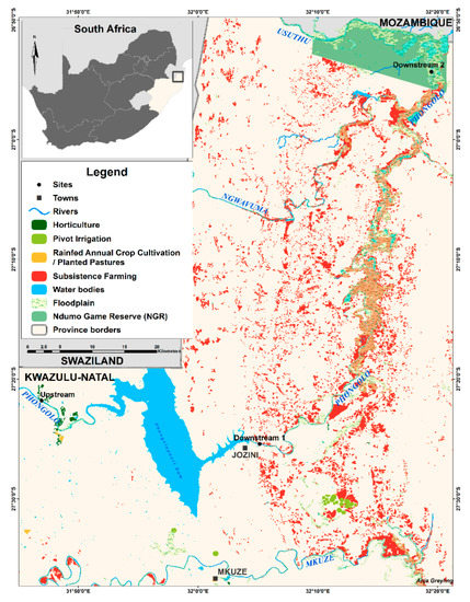 The lower Phongolo River and the associated floodplain starts below the Pongolapoort Dam, stretching approximately 80 km downstream to the confluence of the Phongolo and Usuthu rivers at the international border with Mozambique within the conservation area of Ndumo Game Reserve (NGR). It is South Africa’s largest riverine floodplain, with an area of 120 km2 [66,72]. Approximately 40% of the floodplain lies in South Africa, while the remaining 60% is found in Mozambique, forming part of the Rio Maputa River floodplain [20,73,74]. Ndumo Game Reserve is the only protected region of the Phongolo River and floodplain. Many endangered, rare and endemic species are found in the floodplain area, most of which are highly dependent on the river and the numerous temporary, permanent and floodplain associated wetlands [61,75]. Even though NGR is considered such an ecologically important region, it is severely under threat, as it is surrounded by both subsistence and commercial agriculture. A large agricultural irrigation scheme also operates upstream of the reserve in its catchment area [74]. The eastern part of the reserve is also utilized by the local community as a farming area and local people fish in the river within NGR and actively abstract water from the river for their crops as well (pers. observation; [66], Figure 1).