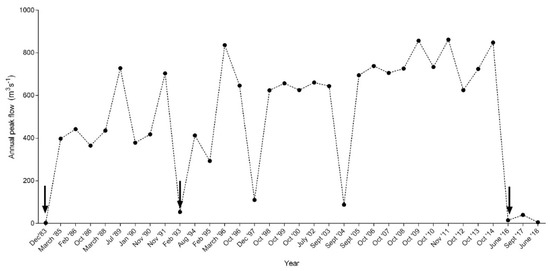 Annual peak flows of Phongolo River downstream of dam measured from 1983 to 2018. Arrows indicate peak years of severe droughts in 1983, 1993 and 2016 (available from https://www.dwaf.gov.za/Hydrology/Verified/hymain.aspx. Accessed on 4 June 2019).