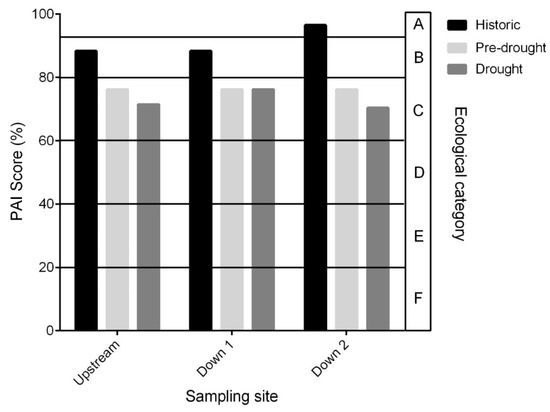 The PAI, a water quality index developed for the South African eco-classification determination process, was applied to determine the present water quality status of the study area. The PAI is a tool used to determine the state of the physical and chemical water quality for a resource unit or a specific site. The PAI makes use of a Microsoft Excel-based weighting, ranking and rating framework that allows for the assessment of individual variables, the integration of the variable outcomes and then of the integrated overall water quality state [51]. This is based on a multi-criteria decision analysis that considers a range of water quality variables. These include pH, salts, temperature (°C), turbidity/clarity, dissolved oxygen (mg L−1) and various toxicants [52]. Ranking (1–4) and weighting (0–100%) relates to the state of water quality under natural conditions. The importance of each of the variables (where 1 is least and 4 most important) is determined by whether the river is perennial or not, average width of the river and geomorphic zone [53]. The PAI compares each water quality variable to reference conditions in order to determine the degree to which each variable has changed, and this is rated from 0–5 (where 0 is no change and 5 is extreme change) based on the degree with which water quality variables have changed from the reference conditions as well as the importance of each variable in relation to the possible biotic responses it may cause. The result is that each site is assigned an ecological category, ranging from A to F and a score ranging from 0 to 100 (Table 2) [52]. Weighting and ranking of the physicochemical variables for the Phongolo River was based on characteristics that are important for lowland rivers [53]. In lowland rivers, the order of metrics from most to least important are toxicants, nutrients, dissolved oxygen, temperature, pH, salts and water clarity [53]. This analysis was applied to determine the PAI of each of the three sample sites (Upstream, Downstream 1 and Downstream 2 respectively). In order to determine the possible changes in water quality, first a historic PAI was calculated to assess the initial state of the river. Data from 1972 to 1976 from upstream of the impoundment were used to calculate the historic Upstream and Downstream 1 PAI. Recordings for Downstream 1 only started in 1984 and it is likely that water quality had already changed after the drought of 1983 and cyclone of 1984. However, even though the Pongolapoort Dam had been completed by 1973, flow was not yet regulated during this period and water flowed through unrestricted [78]. Water quality immediately below the impoundment would therefore have been similar to upstream of the impoundment. The historic water quality of Upstream were therefore used as a proxy for historic conditions at Downstream 1. Data from 1980 to 1982 were used to calculate the historic Downstream 2 PAI. More years could not be included due to the drought of 1983 and cyclone of 1984. Then, using data from 2009 to 2014, a PAI of pre-drought conditions was calculated to determine the water quality before the recent severe drought of 2015–2017. Using data from 2015 to 2017, a final PAI was calculated to determine whether water quality had changed during the severe supra-seasonal drought.