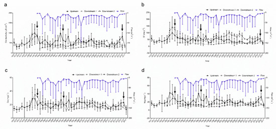 Line graphs indicating mean (±SD) trends in conductivity (a), chlorides (b), calcium (c) and magnesium (d) measured from 1972 to 2017 at the Department of Water and Sanitation (DWS) monitoring stations located above and below the Pongolapoort Dam. Arrows indicate peak years of severe drought. Annual flow for each available year is indicated by the blue line. Upstream—Monitoring station located above the dam; Downstream 1—Monitoring station located below dam wall. Downstream 2—Monitoring station located within Ndumo Game Reserve. Significant differences between years and sites are indicated in the text.
