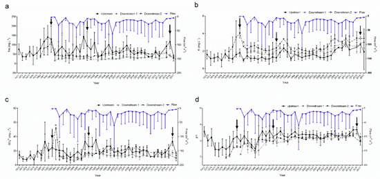 Line graphs indicating mean (±SD) trends in sodium (a), potassium (b), sulphates (c) and pH (d) measured from 1972 to 2017 at the Department of Water and Sanitation (DWS) monitoring stations located above and below the Pongolapoort Dam. Arrows indicate peak years of severe drought. Annual flow for each available year is indicated by blue line. Upstream—Monitoring station located above the dam; Downstream 1—Monitoring station located below dam wall. Downstream 2—Monitoring station located within Ndumo Game Reserve. Significant differences between years and sites are indicated in the text.