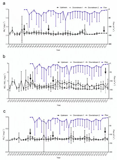 Line graphs indicating mean (±SD) trends in ammonium (a), nitrates/nitrites (b), and orthophosphates (c) measured from 1972 to 2017 at the Department of Water and Sanitation (DWS) monitoring stations located above and below the Pongolapoort Dam. Arrows indicate peak years of severe drought. Annual flow for each available year is indicated by blue line. Upstream—Monitoring station located above the dam; Downstream 1—Monitoring station located below dam wall. Downstream 2—Monitoring station located within Ndumo Game Reserve. Significant differences between years and sites are indicated in the text.