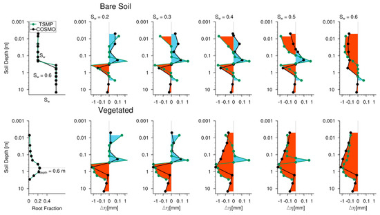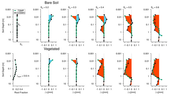 For the vegetated land surface, the dew formation overnight is lower for both models as compared to the bare soil runs, which is now lower in the COSMO runs (see different, but positive for in the upper layers). For , remains positive for COSMO but becomes negative for TSMP in the upper layers, with lower amplitudes as compared to the bare soil case (Table 2). At initial soil saturation , only the shallow uppermost layer gets drier in the TSMP run while in the COSMO run almost the whole soil column significantly dries. This is consistent with its higher evapotranspiration (Table 2). For initial soil saturation , both models show very similar and overall high decreases in soil moisture. For both, bare soil and vegetated land, at , soil moisture in the TSMP run slightly increases (<0.1 mm) in the lowest level, which probably results from flux exchanges with the simplified groundwater model used in CLM as the bottom boundary condition