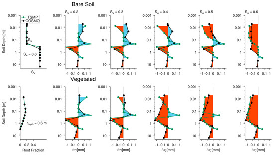 where the terms and are the relative saturation in the beginning and end of the one-day simulation, respectively, is the porosity, and is the soil depth of the ith layer. The initial relative saturation for the shallow upper layer is hereafter simply referred to as . A modulus transformation as suggested by [32] is used to visualize the vertical profile of , which varies by 2 to 3 orders of magnitude in both positive and negative direction. The vertically integrated diurnal change in soil moisture content is summarized in Table 2.