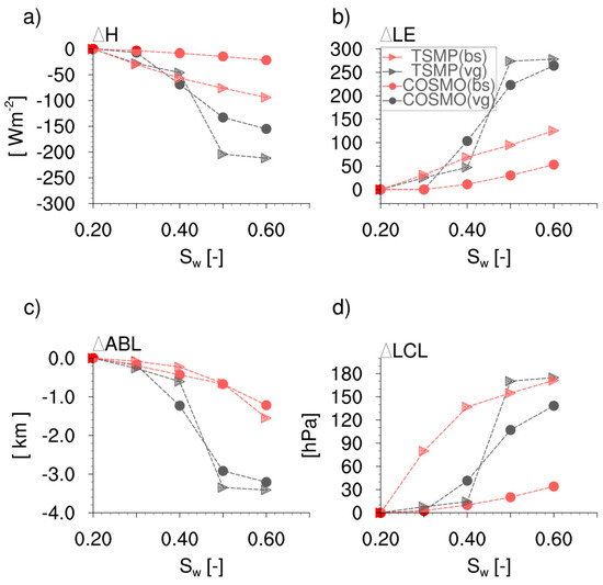 Figure 4a,b show the response of the mean sensible (H) and latent heat fluxes (LE), respectively, to increasing initial soil moisture for the CSDR experiment. As expected, H decreases and LE increases monotonically with increasing initial soil moisture. For bare soil (bs, red curves) both fluxes change stronger in the TSMP than in the COSMO simulations. For the vegetated land surface (vg, black curves) the fluxes change in jumps, which happen for COSMO between initial soil saturations of 0.3 and 0.4 and in TSMP more gradually between 0.4 and 0.5. In general, the TSMP turbulent fluxes respond stronger to changes in the initial soil saturation for both bare soil and vegetation as compared to COSMO.