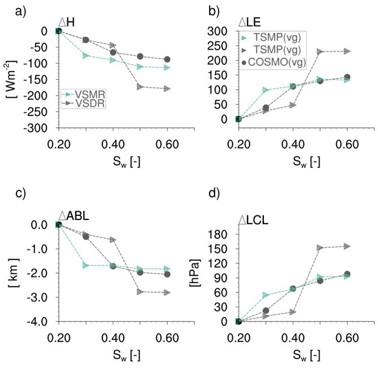 The sensitivity of the ABL evolution to changes in soil moisture also impacts the lifting condensation level (LCL) and the convective available potential energy (CAPE). Figure 4d compares the change of the mean LCL with initial soil moisture for the two land use types for the same averaging period as ABL height. With increasing soil moisture, the mean LCL height decreases (i.e., increase in pressure) while the mean CAPE increases (not shown here). Changes are larger for TSMP as compared to COSMO, and the jumps for vegetated land surface are stronger in TSMP. In TSMP, the responses for vegetation and bare soil match at . For the VSDR experiment, in both models drops for vegetation, but the jump in TSMP remains (Figure 5d). For the VSMR experiment, this jump disappears and converge for both models for .
