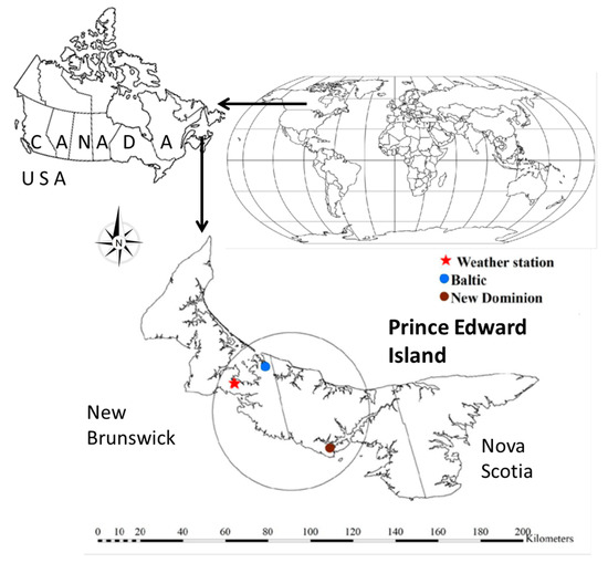 Prince Edward Island is the smallest but most populous Canadian Atlantic province, having a pastoral landscape consisting of several rolling hills, woods, reddish white sand beaches, ocean coves, and red soil. With the uneven topography of Prince Edward Island, its streams are mostly non-contagious. For this study, the Baltic River and Long Creek watersheds situated in the center of Prince Edward Island were selected as experimental watersheds because of the relatively large number of irrigation wells in the area that might have contributing fluctuations in GWLs (Figure 1).