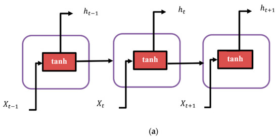 The LSTM neural network is a special kind of RNN, which is a sequence-based model that can store and relate the previous information in a sequence, enabling it to predict time series problems. However, RNNs cannot store longer sequences because of the gradient vanishing problem in early layers. Gradient vanishing in an early layer is sometimes referred to as short-term memory neural networks. All RNNs form a chain-like structure as the information flows through them (Figure 3a). The RNNs store information in each stage based on time/sequence steps in the form of a hidden state, i.e., ht for each input Xt. The tanh function in the memory block of an RNN scales the input data between −1 and 1.
