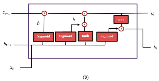 The LSTM addresses short-term memory problems by adding more states in the memory blocks of the RNN. In LSTM, a forget state (ft) and a cell state (Ct) are added to retain the temporal and sequal dependence of previous blocks. The ft in LSTM has the ability to discard or keep the information based on the sigmoid function output values. The values closer to 1 are kept, and those closer to 0 are forgotten. After passing ft, the input variable Xt and the previous cell hidden state ht–1 are passed through the sigmoid and tanh functions. The dot product of the tanh and sigmoid functions are then added with ft to compute Ct. The more detailed overview of LSTM information flow memory block is described in Figure 3b.
