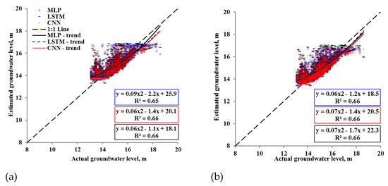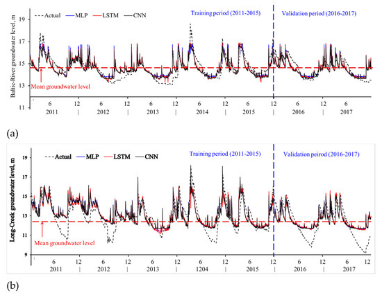 It is noticeable that the MLP, being the simplest type of ANN, performed well at the validation stages of both watersheds compared with the more advanced ANNs, including the LSTM and CNN models. In a similar study of GWL estimation using ANNs, Mueller et al. [19] reported that the MLP outperformed both the LSTM and CNN models. At the training stage, the performance of the CNN was greater than that of the other ANNs. This could be due to the additional parameter-learning functionalities in the CNN, such as the convolutional and max-pooling filters, which were not the part of the MLP and LSTM models.