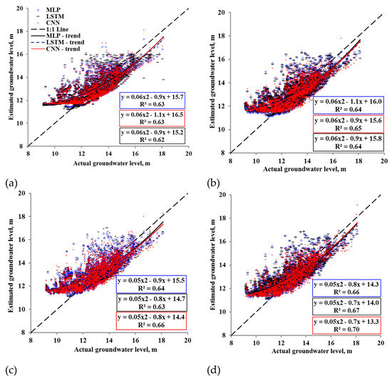 Furthermore, polynomial relationships between the predicted and actual groundwater level suggest that increasing the number of variables from 1 to 4 increased the R2 from 0.62 to 0.70 for the Long Creek watershed (Figure 7). A similar trend was observed for the Baltic River watershed as the R2 was raised from 0.66 to 0.71 for the 1-input and 4-input variable models, respectively (Figure 8). These results suggest that the stream level and stream flow variables should be considered in defining the overall variability of GWLs. These variables contribute to the role of stream level and stream flow in a watershed, as reported in the literature [26]. Recent study conducted by Lee et al. [27] found the similar relationship between GWLs and stream level. Zhang et al. [10] compared feedforward neural networks with LSTM in GWL prediction in the Hetao irrigation district, China. Contrary to our findings, their results suggest that the LSTM model is a better predictor of GWL modeling than the MLP. The CNN performed better with a higher number of input variables compared with the LSTM and MLP models. For example, for both watersheds, the MLP performed slightly better than the CNN for the 1- and 2-input variable models. However, the accuracy of the CNN was higher than that of the MLP in the 3-and 4-input variable models for both watersheds (Figure 7 and Figure 8). The higher accuracy of the CNN with a certain number of variables may indicate the advantage of the CNN in dealing with more complex relationships in comparison with the MLP and LSTM models. The additional functionalities of convolutions and max pooling helped the CNN to obtain higher accuracies with a higher number of inputs.