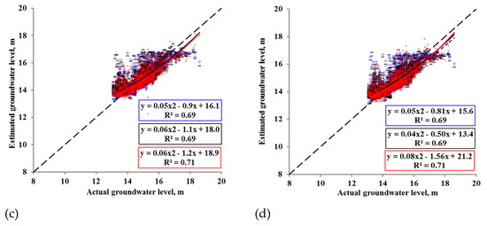 The Baltic River estimated groundwater levels for (a) 1-input, (b) 2-input, (c) 3-input, and (d) 4-input variable models versus actual groundwater levels, showing under-estimated and scattered data for the 1- and 2-variable models and a 1:1 line overlapping clustered data for the 3- and 4-variable models, respectively. Because of a large number of data points (7671; 2557 for each ANN), the symbols overlap and hide one another.