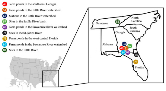 The use of surface water has been considered the primary issue related to water resource management [57], and contaminated irrigation water has been identified as a cause for several outbreaks of foodborne illness [15]. As previously mentioned, several factors, such as geographical location, land use, rainfall, temperature, seasonality, and water physicochemical characteristics can directly affect the microbial quality of water used in agricultural practices, which greatly impacts the risk of foodborne pathogen contamination on fresh produce. Previous studies that have examined microbial quality of production water sources in the Southeastern U.S. are summarized in Table 2 and will be discussed in more detail. Figure 1 illustrates the geographical location of the studies conducted in the Southeastern U.S. that are discussed within this review. Articles included in this section were peer-review publications that investigated environmental factors, geographical locations, land use, and physicochemical aspects related to microbial contamination of agricultural water sources within the six states discussed in this review. Databases such as PubMed, Web of Science and Google Scholar were used to search and review articles matching the keywords: Salmonella, E. coli, Campylobacter jejuni, coliforms, fecal contamination, irrigation water, agricultural water, surface water, watershed, wildlife, manure, rainfall, temperature, season, conductivity, water pH, turbidity, water chemicals, Florida, Georgia, Alabama, Tennessee, North Carolina, South Carolina. Articles that investigated water sources not intended for agricultural use were not included in this review.