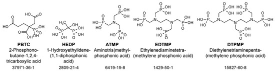 Despite poor biodegradability, phosphonates are increasingly used as complexing agents in detergents, care and cleaning agents (DCC), and as industrial chemicals. The phosphonates most frequently contained in these products are 2-phosphonobutane-1,2,4-tricarboxylic acid (PBTC), 1-hydroxyethylidene(1,1-diphosphonic acid) (HEDP), aminotris(methylphosphonic acid) (ATMP), ethylenediaminetetra(methylene phosphonic acid) (EDTMP), and diethylenetriaminepenta-(methylene phosphonic acid) (DTPMP) (Figure 1) [1]. In Germany, the phosphonate usage in domestic DCC products steadily increased 4.4-fold between 1989 (2000 t/a) and 2017 (8816 t/a) (Figure A1) [2,3]. Together with the use in other applications, e.g., in water treatment, surface coating processes, pulp and paper industry, and textile industry, the total annual use is estimated to add up to 94,000 t/a (in 2012) worldwide, which is about 1.7-fold higher than in 1998 (56,000 t/a) [1,4,5].