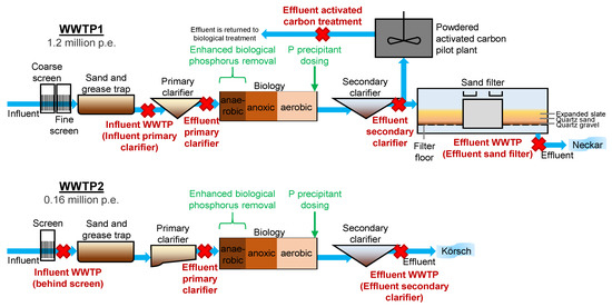 Process overview of both investigated wastewater treatment plants (WWTPs) (p.e.: population equivalents, red crosses: sampling points).