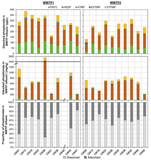 Nowack [16] concluded that phosphonate concentrations in the influents of WWTPs are strongly influenced by industrial facilities in the catchment area of the WWTPs. Interestingly, however, in WWTP2, which is almost exclusively fed by municipal wastewater, the total phosphonate content (131–313 µg/L) was similar to WWTP1 (162–384 µg/L), which has a moderate industrial wastewater burden.
