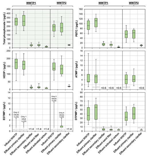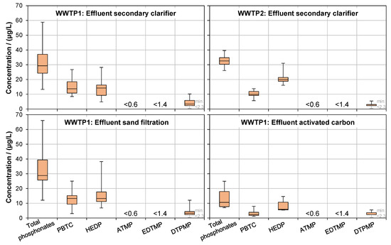 The concentrations and proportions of phosphonates adsorbed to solids in the effluents of the various treatment stages were not determined within the scope of this study. For this reason, no exact statement can be made about the phosphonate-P/PP ratios. The phosphonate loads of activated sludge are expected to be significant. A Europe-wide balancing of phosphonate freights implied an estimated average sewage sludge load of 1.2–1.5 g/kg [35]. Since the drift of activated sludge particles originating from the secondary treatment makes up for the major part of the solids occurring in the WWTP effluents, the quantification of adsorbed phosphonates should be considered in future investigations.