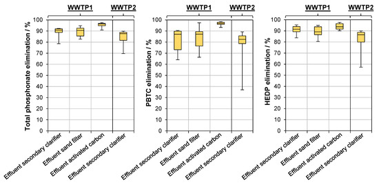 The elimination rates of dissolved total phosphonate, HEDP, and PBTC by individual treatment stages of both WWTPs are shown in Figure 6. The total phosphonate elimination by secondary treatment in WWTP1 was between 78.6% and 92.4% (median: 90.7%). In WWTP2, it was slightly lower (69.7–89.9%, median: 87.7%). In the majority of samples, the secondary effluent concentrations of ATMP (elimination rates: WWTP1: >47.4% to >96.0%, WWTP2: >49.6% to >91.5%), EDTMP (WWTP1: >3.4% to >70.2%, WWTP2: >1.4% to >86.8%), as well as DTPMP in some samples (WWTP1: 72.3% to >96.1%, WWTP2: >83.7% to >96.0%) were below the LOQ, which is why only minimum degrees of elimination could be derived. Aminophosphonates are therefore not listed in Figure 6. HEDP (WWTP1: 83.7–95.4%, median: 91.5%; WWTP2: 57.3–89.8%, median: 86.4%) was eliminated slightly better than PBTC (WWTP1: 64.1–90.5%, median: 87.0%; WWTP2: 37.0–89.3%, median: 82.5%). Nevertheless, the HEDP effluent concentration in WWTP2 was significantly higher than that of PBTC (Figure 5). The degree of elimination is therefore not the sole criterion for the emissivity of phosphonates by WWTPs and should therefore always be considered in relation to the initial and discharge concentration. Furthermore, it is striking that, in contrast to aminophosphonates, the elimination rate of PBTC during secondary treatment never exceeded 91%.
