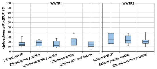 In both WWTPs, the concentration of the DUP fraction strongly dropped between influent and effluent (median DUP concentrations: 0.44 mg/L in WWTP1 influent and 0.031 mg/L in WWTP1 effluent; 0.24 mg/L in WWTP2 influent and 0.042 mg/L in WWTP2 effluent; Figure A4). In most samples, the contribution of phosphonate-P to the DUP fraction was between 10% and 30% (WWTP1) and between 15% and 40% (WWTP2) and therefore significant (Figure 7). Two times the maximum ratio was almost 100% (effluent activated carbon and influent WWTP2). In both cases, the lowest DUP concentrations of all 10 samples at atypically high phosphonate concentrations were measured. The DUP concentration is calculated from two values, which themselves can have minor errors. It is therefore also possible that an exceptionally slightly incorrect determination of the DUP concentration may have occurred in these samples. The relative proportion remained in a comparable range throughout all stages of the wastewater treatment process, implying that the elimination of DUP correlates well with the elimination of dissolved phosphonates.