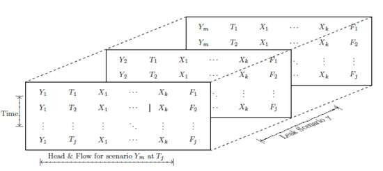 The matrix should be read taking snapshots of the DMA at any given moment. So, for the leak scenario Y1, there is pressure Xk for the node k at given time Tj. The data set can be melted into a single matrix with each Y label repeated, which will be easier manipulated by RStudio, an open source software for R [31]. Considering there is not always a sensor at all the nodes, the pressures for the nodes which do not have a sensor is interpolated used Kriging, as explained in [19].