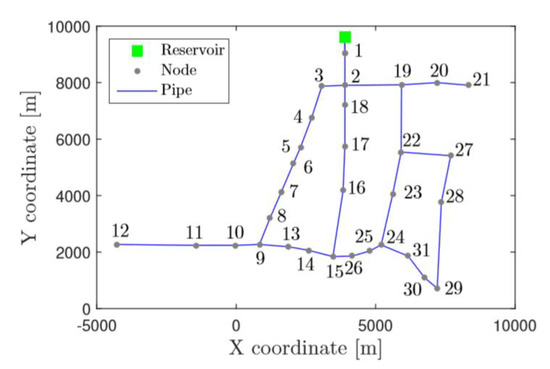 The Hanoi DMA (Figure 3) is used as the case study to initially illustrate the performance of the proposed approach. In this network, the reservoir acts as the inlet node of this DMA. Considering data for all the nodes are expected to generate, all the nodes are assumed have a sensor and the real distribution of the real sensor nodes placed inside the Hanoi network is ignored during the simulation phase. The simulation is obtained using the simulator EPANET 2 [36], where for each leak scenario, of the 31 nodes, a leak is simulated with one-hour time steps lasting 96 h. All the generated data from the simulation are used for calibrating the classifier models. A perfect case without leaks has been used as a reference.