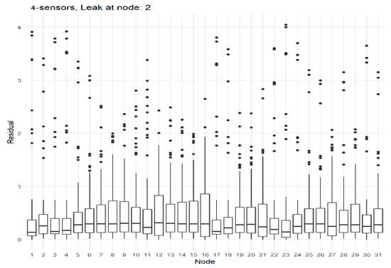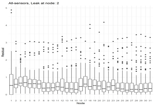 In these boxplots, it is clear to conclude that, leak localization is very dependent on the amount of nodes with sensors. A good result can be expected with sensors at all the nodes with respect to how the residual is much higher in the node which has the leak.