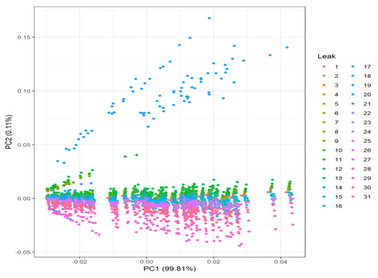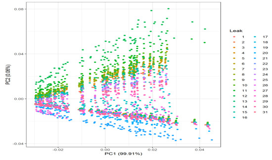 Principal Component Analysis (PCA) [38] has been performed on the case with sensors at every node (Figure 6), and the non-perfect-information case (Figure 7), in which there are only four sensors placed inside the network (12, 16, 21, and 27) [24]. Removing time and flow features to see the structure of the data, a sort of rainbow effect can be detected, whereby thanks to the linear combination of pressures, it is able to differentiate where the different leak locations are. This, in turn, should translate to better and easier classification results when add to the flow.