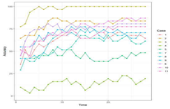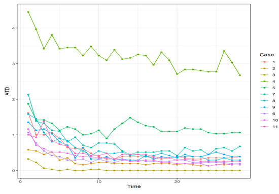 For the validation data set, the evolution over time of the Bayes time reasoning is plotted in Figure 8, which provides an accuracy boost in less than 5 h with a significant increase. ATD below 1 in most cases was obtained in less than 3 h (Figure 9).
