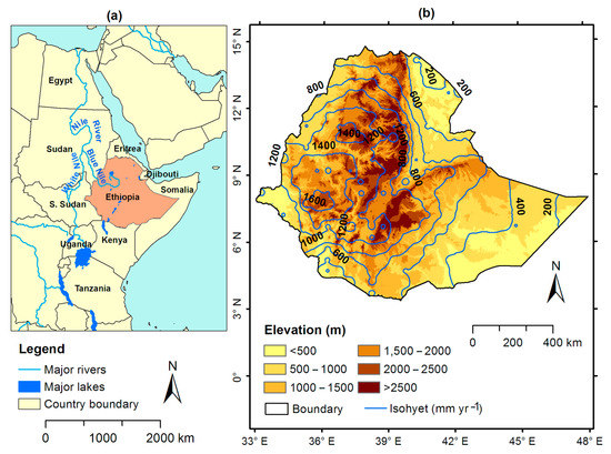 Location map of the study area: (a) Location of Ethiopia in eastern Africa; (b) A map of Ethiopia showing the mean annual rainfall distribution at 200 mm interval isohyets (blue lines) based on Climate Research Unit (CRU: https://www.cru.uea.ac.uk/data) data of 1951‒2015. The background provides elevation data extracted from a 90 m resolution Shuttle Radar Topographic Mission (SRTM: http://srtm.csi.cgiar.org/).