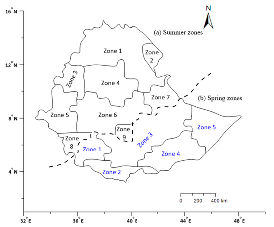 Dividing Ethiopia into homogenous rainfall zones was a crucial process due to the highly spatial variation in rainfall. Different zoning methods have been described in many studies [13,37,38,39,57]. For this study though, a new division scheme was introduced based on the abovementioned rainfall data, as the standard classification of Ethiopia into three zones seemed inaccurate. The methodology followed herein was that of Gissila et al. [13]. Briefly, in the first procedure, cross-correlation was applied to identify the relation between monthly averaged rainfalls for various grids on each zone. In the second step, the mean correlation coefficient for rainfall zones was derived. Thus, grids showing similarity in annual rainfall cycles could be categorized. Subsequently, the boundaries of each zone were adjusted through the mean intergrid correlations between and within zones to ensure zonal homogeneity.