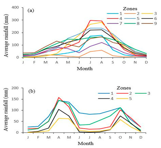 Mean monthly rainfall over Ethiopia for (a) nine summer zones (1951–2010) and (b) five spring zones (1951–2000).