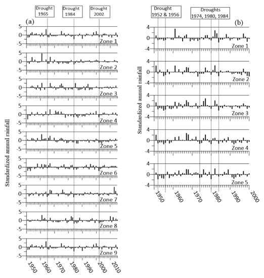 Standardized time-series plot of annual rainfall totals for (a) summer rainfall zones (1951–2015) and (b) spring rainfall zones (1951–2000).