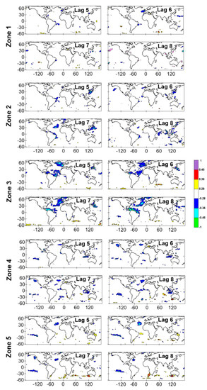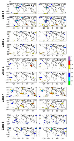 Maps showing the cross-correlations between April/May spring rainfall of each zone and SSTs for different oceanic regions at a lag time of 5–8 months.