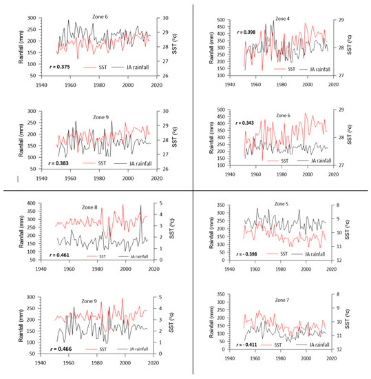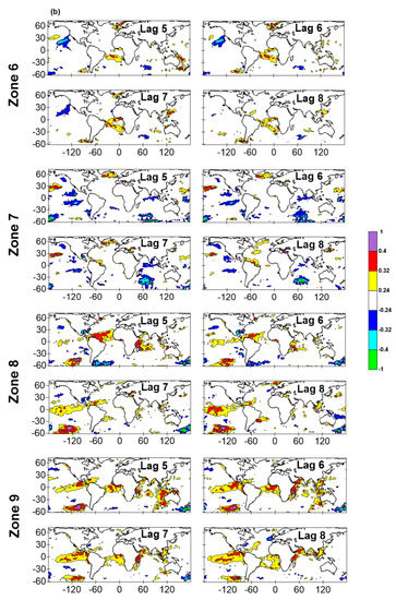 Significant cross-correlations between selected summer rainfall zones and oceanic SSTs at lag times of 5–6 months for zones (6 & 9) and (8 & 9) (left side) and 6–7 months for zones (4 & 6) and (5 & 7) (right side) for the rainfall time series (1951–2015). Zones 8 and 9 show the calculated (r) by subtracting positive and negative correlations.