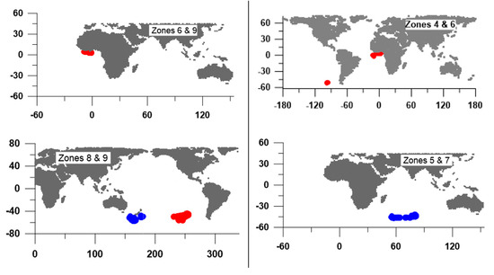 Extraction of common summer rainfall zones having the same significantly correlated SST regions (r ≥ 0.32) at lag times of 5–6 months (left side) and 6–7 months (right side). Red and blue colors indicate positive and negative correlations, respectively.