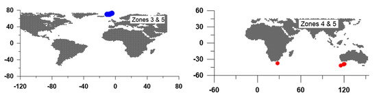 From the standpoint of prediction, possible correlations of SST with rainfall at longer lag times are potentially effective. For instance, at lag time of 6–7 months, the northern Atlantic Ocean SST showed a significantly negative correlation with spring rainfall zones 3 and 5 representing southern and southeastern regions of Ethiopia (left side of Figure 9). Moreover, at 7–8 months, two regions at the southern Indian Ocean exhibited a strong positive influence on spring rainfall due to Ethiopia’s location for the southeastern zones 4 and 5 (right side of Figure 9). The passage of ITCZ controls the shape of seasonal rainfall cycle. Annually, it oscillates from 15° N in July to 15° S in January and back again causing monomodal and bimodal rainfall patterns over northern and southern parts of Ethiopia, respectively [72]. In addition to the difference between the land surface and Indian Ocean in the heat capacity inducing ITCZ’s meridional arm. The latter produces rainfall during February and March over the southwestern part of Ethiopia [40]. Additionally, the strength and location of upper-level feature of the subtropical westerly jet (STWJ) affects spring rainfall over the country [4].