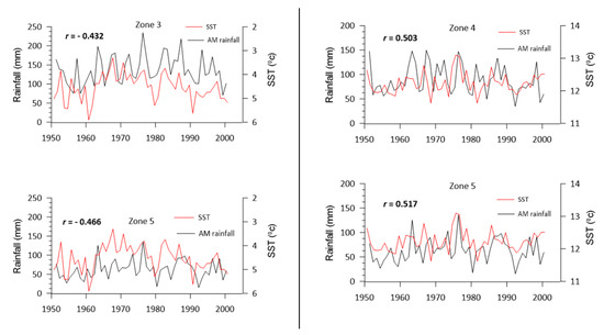 As shown in Figure 8, the common spring rainfall zones having the same significantly correlated SST regions were statistically extracted and represented at significance levels. In particular, this study relied on the 0.01 significance level with r = ±0.36, showing a significantly strong correlation at the lag period of 5–8 months between April/May rainfall and SST at five zones.