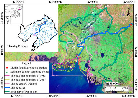 This study was conducted in the tidal flats at the boundary between the land and the sea of the Liaohe estuarine wetland, located in Panjin City, Liaoning Province, in Northern China (Figure 1). This area is an important material exchange zone in Liaodong Bay, and the sedimentation process is affected by runoff from the Liaohe River, ocean tides and human factors. The main material source for the continuous tidal flat deposition in the Liaohe estuary wetland is the sediment discharge of the Liaohe River. The study area is in a warm temperate continental semi-humid monsoon climate zone with four distinct seasons, with rain and heat in the same season, dry and cold in the same period, an annual average temperature of 8.40 °C, an annual average precipitation of 623.20 mm, and an annual average evaporation of 1669.60 mm. According to the data of the Resource and Environment Data Cloud Platform of the Chinese Academy of Sciences (http://www.resdc.cn/data.aspx?DATAID=283), the main sediment source contribution area of the Liaohe estuary wetland tidal flat is the main stream basin of Liaohe River. During 1985 to 2017, the area of cultivated land, sandy land, construction land, and beaches and tidal flats increased by 4.36%, 84.0%, 85.0% and 29.5%, respectively, while the forest land, grassland, and water area decreased by 4.96%, 46.72%, and 9.52%, respectively [32].