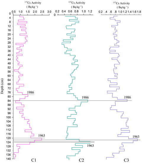 The year was calibrated by analyzing the 137Cs-specific activity peak. The sediment’s deposition time information was determined based on the 137Cs nuclear accumulation precipitation peak in the Northern Hemisphere, which appeared in 1963, and the Chernobyl nuclear leakage secondary accumulation peak, which appeared in 1986 [36,37].