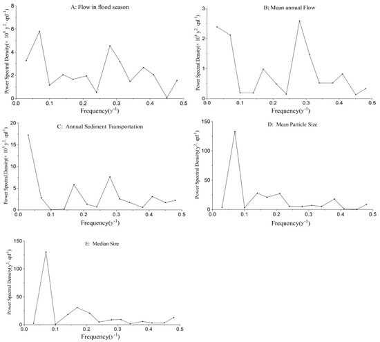 Meanwhile, according to the analysis of the spectrum power (Figure 5), the cycle corresponding to the high-power spectrum peak value (5.8 × 105 a2·cpd−1) of the flow in the flood season was consistent with the cycle corresponding to the high-power spectral peak values (132.75 a2·cpd−1 and 130.41 a2·cpd−1) of the mean particle size and median size, which was a 14 to 15 year recurrence period. The cycles corresponding to the high-power spectrum peak values (2.59 × 104 a2·cpd−1 and 7.62 × 105 a2·cpd−1) of the mean annual flow and the annual sediment discharge were consistent with the cycles corresponding to the high-power spectral peak values (30.69 a2·cpd−1) of median size, which was a 5 to 6 year recurrence period.