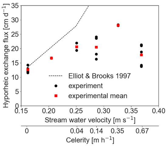HEF increased monotonically from the slowest stream water velocity (stationary streambed) until it reached a maximum at stream water velocity of about 0.35 m·s−1 (celerity of 0.35 m·h−1). Further increase in stream water velocity resulted in a decrease of HEF (Figure 1). The variability among the different experiments with the same flow conditions was attributed mainly to experimental sensitivity, which was larger at faster stream water velocities. Exchange fluxes were modeled to calculate predictions based on advective pumping [18]. Modelling was conducted using a hydraulic conductivity of 4.62 × 10−4 m·s−1. For stationary beds, the modelled results were similar to the measurements, but deviations increased as celerity increased (Figure 1).