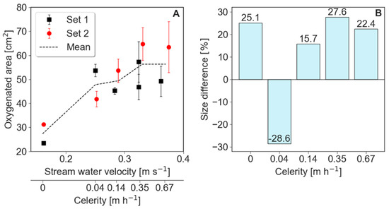 The spatial and temporal mean of the total oxygenated area under different stream water velocities and celerities (A). Each condition is displayed chronologically as Set 1 and 2, and the dotted line is the arithmetic mean. Error bars denote standard deviations of each measurement. In general, the areas in Set 2 were greater than in Set 1, except for bed form celerity of 0.14 m·h−1, as shown by the percentage difference in area size between Set 1 and 2 (B).