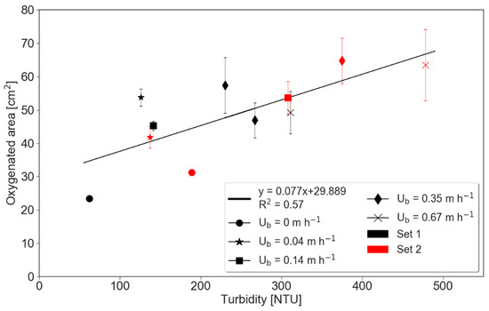 Relationship between oxygenated area and surface water turbidity. The experimental conditions, labelled by their celerities, are additionally separated into Set 1 and 2 (first and second run of the same celerity). Whiskers denote standard deviations.