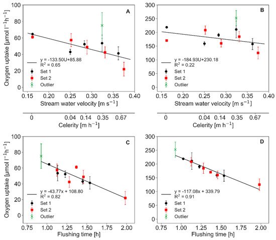 The oxygen flux into the sediment was derived with Equation (4) using the mean of the HEF, as shown in Figure 1, and the oxygen concentrations in the water (Table 1). The calculated oxygen fluxes following Equation (4) trailed the pattern of the HEF (Table 2). Table 2 also displays modeled fluxes following the model presented by Ahmerkamp et al. [20]. Nevertheless, although the prediction following Ahmerkamp et al. were of the same order of magnitude (and only slightly lower for stationary bed forms), increasing deviations were observed as celerity increased. Oxygen uptake rates that were calculated with the delta method covered a range from 22 to 75.1 µmol·L−1·h−1, and were considerably lower than rates of the maximum uptake method with 125.1 to 252.4 µmol·L−1·h−1 (Figure 5). The oxygen uptake rates showed a decreasing trend with increasing stream water velocity and associated bed form migration celerity in both model approaches. The aforementioned shift of the size of the total oxygenated area between experimental runs (Figure 3) translates into higher oxygen uptake rates of the experimental results from Set 1. An exception is again the first run under the slow celerity (0.04 m·h−1), Run 2, which was the first measurement with a moving bed. It exhibits an unusually high value, but is not included in calculating the trends in Figure 5A,B (marked as an outlier in the legend). Because HEF, oxygen fluxes, and the oxygenated zone were all influenced by bed form celerity in a complex manner, the resulting oxygen consumption rates varied as well, and were negatively correlated with increasing flushing times (Figure 5C,D).